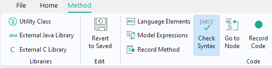A close-up of the Method tab with the Check Syntax option highlighted. To find bugs in the code that are not related to syntax, the Chatbot window can be of help.