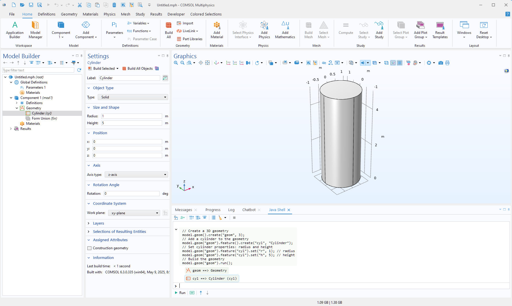 The COMSOL Multiphysics UI showing the Model Builder with the Cylinder node selected, the corresponding Settings window, and a Cylinder model in the Graphics window. In the example shown here, the following code was generated: